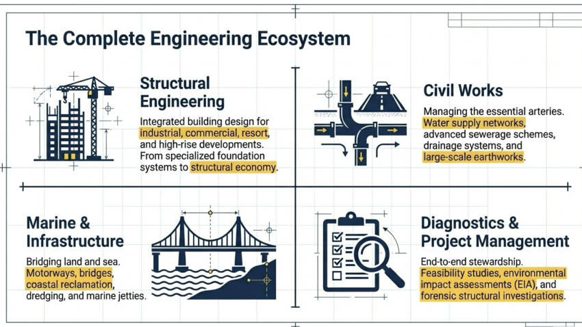 Representative projects: Schlumberger Asian Supply Base, Labuan (heavy-duty marine workshops and offshore supply base); QL Marine Products jetty, Sepangar Bay; Sabah Shipyard, Labuan (sea-wall and 30-acre foreshore reclamation); Petrosab Jetty rehabilitation.